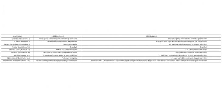 Olumlu Yönleri: Koordinasyon kurulu mekanizması güçlenmiş, fesih ve sözleşme süreci daha sistematik hale gelmiş, protokol süresi kısalarak esneklik sağlanmıştır. Riskleri: Eğitim sorumlusu atamasında idari ağırlık azalmıştır, eğitim yetkinliği şartı, bazı hastaneler için risk oluşturma potansiyeline sahiptir.